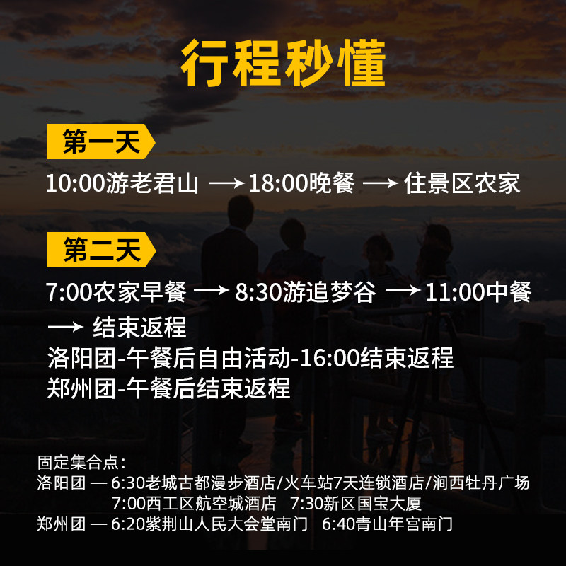 行程已包含老君山景区大门票、往返交通及一晚舒适住宿,差旅人士无需额外操心预订琐事。所有环节由专业团队统筹安排,节省沟通与协调成本,让您在短暂假期中最大化体验效率,把精力留给欣赏美景与恢复状态,真正实现高效度假。