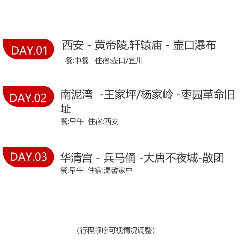 针对差旅人士时间宝贵的特点,本产品精心设计三日两晚动线:首日聚焦西安市区(兵马俑、华清宫),次日北上延安与黄帝陵,第三日返程前游览壶口瀑布并返回西安。全程包车+专业导游,省去换乘与排队烦恼,最大化利用碎片时间。每一站都紧扣“人文+自然+红色”三大主题,确保短暂假期不虚此行。