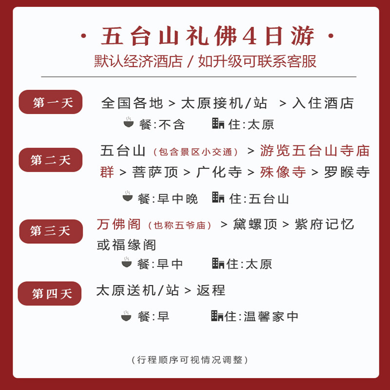 依托武汉‘九省通衢’的交通优势,本产品为中部地区差旅人士提供高效直达五台山的度假方案。含往返机票,节省中转时间;4天行程科学安排五台山核心景点,包括香火鼎盛的五爷庙与历史悠久的殊像寺。在快节奏差旅中嵌入一段慢生活体验,于古刹钟声里找回内心的秩序与平静,实现真正的‘高效休憩’。