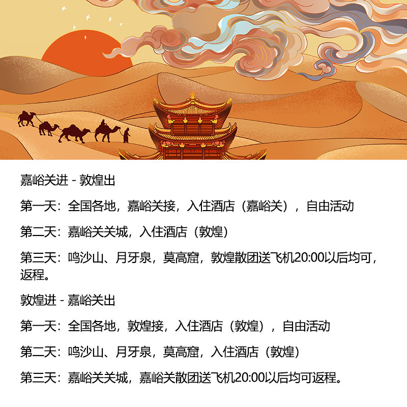 本行程支持从敦煌市或嘉峪关两地灵活出发,特别适合商务差旅人士在完成工作后无缝衔接度假。无需额外中转奔波,节省宝贵时间,让差旅与休闲高效融合。无论是从嘉峪关高铁站还是敦煌机场落地,均可就近参团,真正实现‘落地即游’的便捷体验,极大提升差旅效率与舒适度。