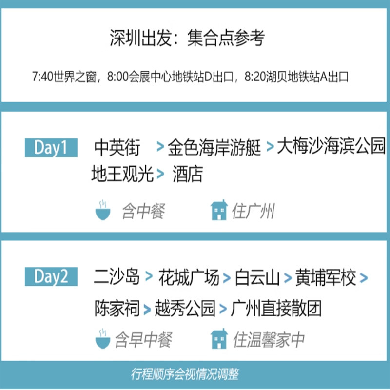 行程覆盖广州与深圳两大粤港澳核心城市,专为频繁往返广深的差旅人士量身打造。全程含巴士游览与专业接送,省去自行规划交通的繁琐。无论是从广州出发前往深圳中英街、地王大厦,还是返回广州游览陈家祠、二沙岛,路线衔接流畅,最大化利用有限时间,实现高效差旅与深度体验的完美结合。