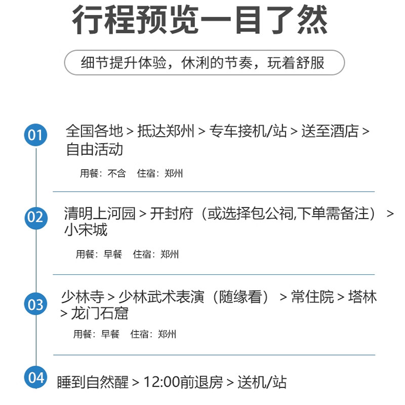 相比单独预订机票、酒店与门票,本打包产品性价比极高。尤其适合从乌鲁木齐、哈尔滨、西宁等远距离城市出发的旅客,节省大量交通成本与时间。4天3晚的黄金时长,既满足短期差旅需求,又完整覆盖河南三大文化IP,是商务人士兼顾效率、预算与体验的理想选择。