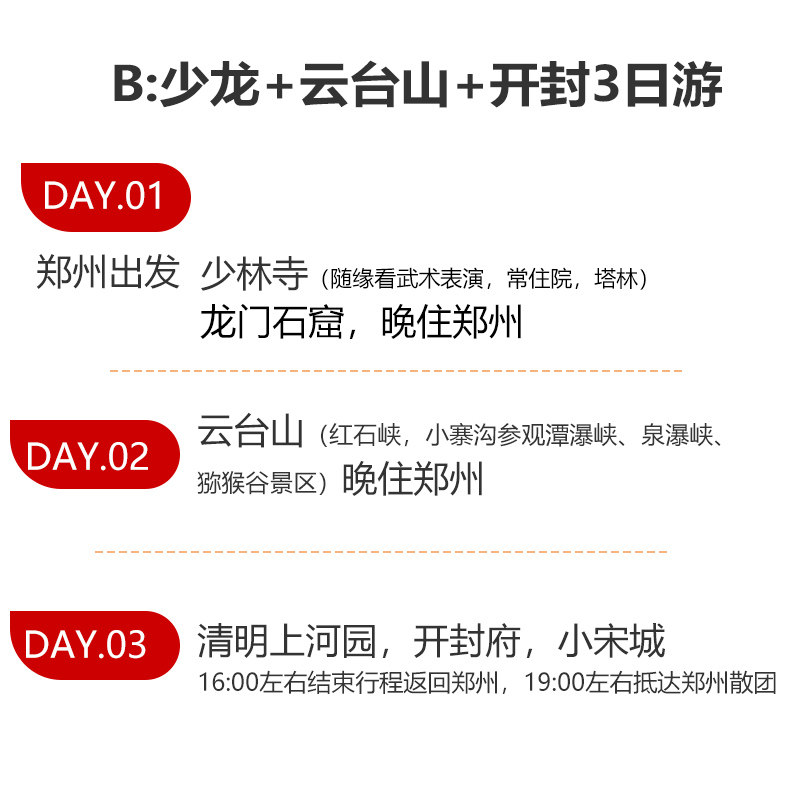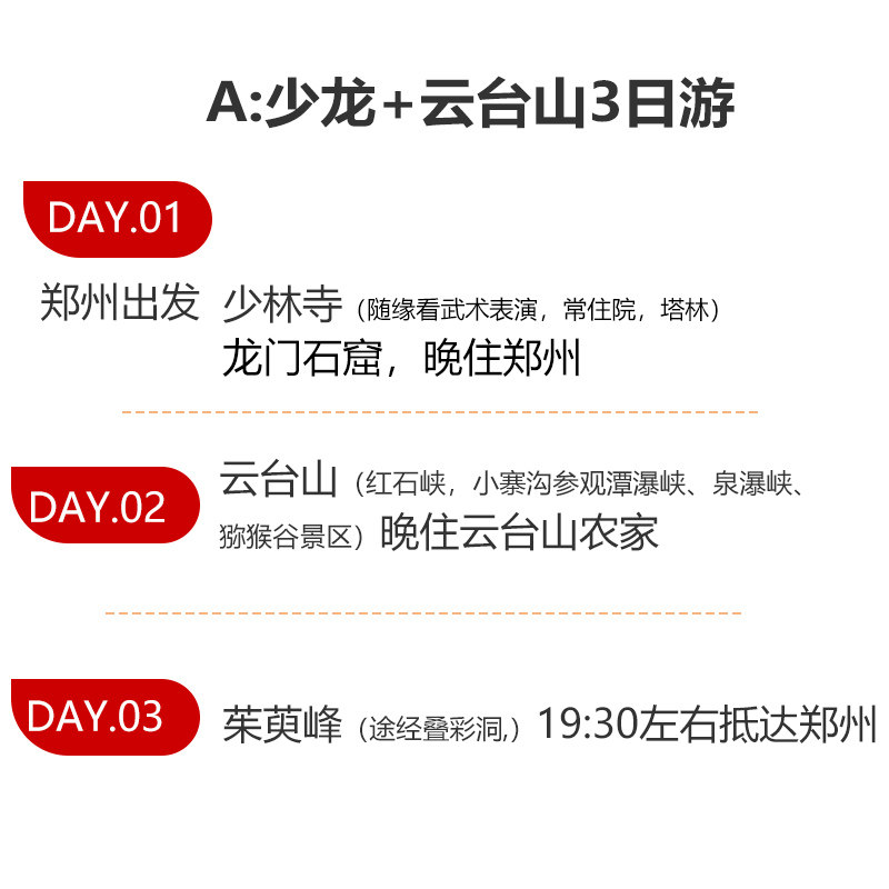 专为现代职场人设计的‘微度假’模式,3天2晚行程精准匹配周五晚出发周日晚返程的黄金窗口,或利用异地出差前后空档。无需额外请假,即可完成一次高浓度文化之旅。路线覆盖河南最具代表性的三大IP——少林、龙门、云台山,确保在最短时间内获得最大旅行价值,真正实现‘出差顺便看世界’的理想状态。