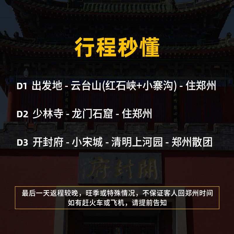 精心规划3日行程节奏,每日景点间车程控制在2小时内,避免长途奔波。首日郑州出发即达洛阳,次日登封+焦作,第三日开封返郑,确保您在完成差旅任务后,仍能高效享受完整假期,并准时返回工作岗位。