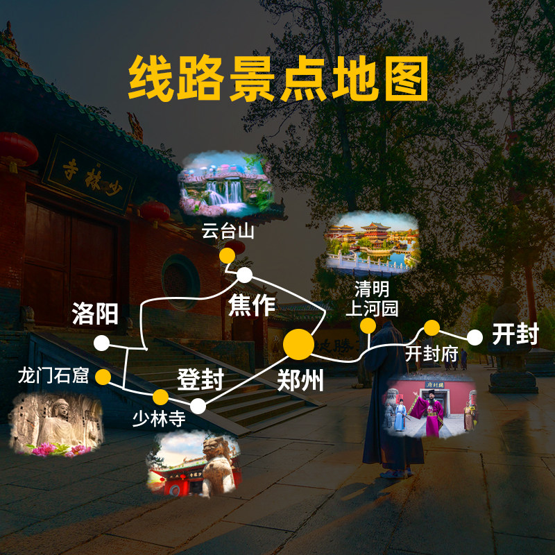 本线路深度融合河南四大文化地标——龙门石窟的佛教艺术、少林寺的禅武精神、开封的宋都遗韵与云台山的自然奇观。差旅途中即可领略中华文明精髓,满足商务人士对高质感文化体验的需求,让短暂旅程充满精神滋养。