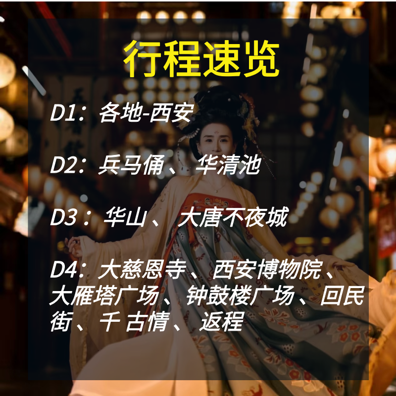 本产品以‘盛唐文化’为主题,整合大唐不夜城、大雁塔、华清池、实景演出等元素,打造沉浸式文化动线。对商务旅客而言,这不仅是一次观光,更是一场高效的主题学习——了解盛唐的政治、艺术、宗教与生活方式。所有景点集中于市区及近郊,交通接驳顺畅,避免无效耗时。差旅之余,收获系统性文化认知,助力跨文化交流与个人素养提升。