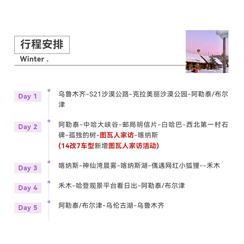 本线路专为差旅人士设计,从乌鲁木齐便捷出发,无缝衔接至阿勒泰地区,涵盖喀纳斯、禾木、白哈巴等核心景区。行程紧凑合理,5天4晚安排科学,既满足高效出行需求,又充分融入自然风光体验。无论是结束商务会议后的放松之旅,还是利用周末延伸的短途度假,都能在不耽误工作的前提下,沉浸于北疆秘境的原始美景之中,实现工作与休闲的完美平衡。