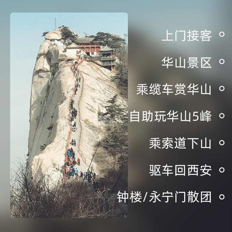 专为差旅人士设计的华山一日游产品,从西安市区上门接客,无需中转奔波,节省宝贵时间。全程包含门票与索道费用,采用省力线路规划,避免体力过度消耗,确保您在紧凑的差旅日程中也能轻松登顶五岳之一的华山。小团2-8人规模,灵活高效,特别适合单人出差途中快速体验自然奇观,返程后可直接投入晚间工作或会议,实现工作与休闲的完美平衡。