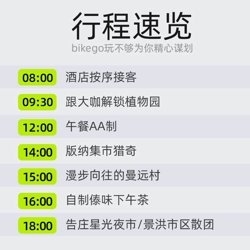 本产品支持单人预订,特别适合商务差旅途中临时起意的短途度假需求。无需凑团、不设最低成团人数,下单即走,极大提升了差旅人士的时间利用效率。无论是会议间隙还是项目结束后的放松时刻,都能快速开启一段沉浸式的西双版纳文化之旅,兼顾工作与休闲,实现高效差旅新体验。