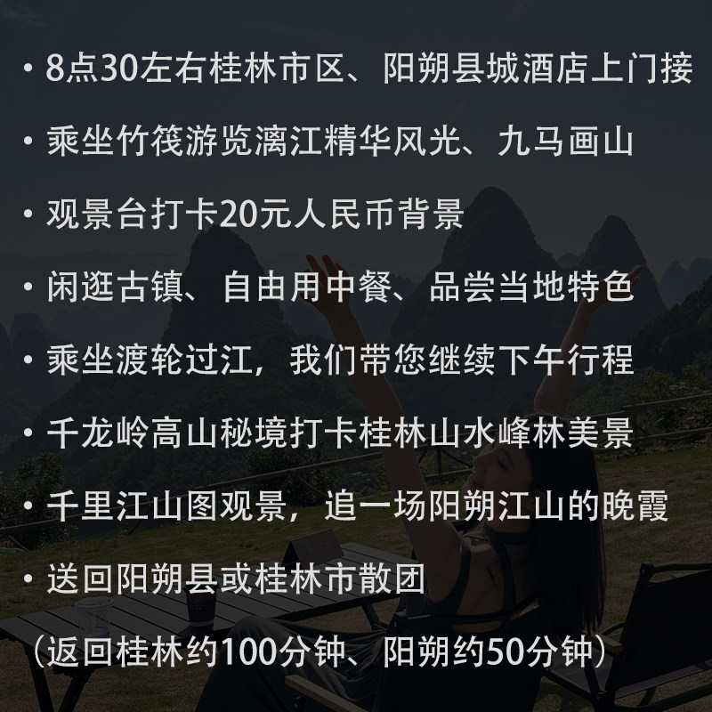 专为商务差旅人士设计,本线路支持灵活出发时间安排,可配合航班或会议日程定制行程。从桂林市区出发,全程包车接送,省去公共交通换乘烦恼,最大化利用有限的差旅间隙。一日内即可打卡漓江精华段、20元人民币背景地及阳朔西街等核心景点,实现高效观光与身心放松的完美平衡,让出差途中也能享受度假体验。