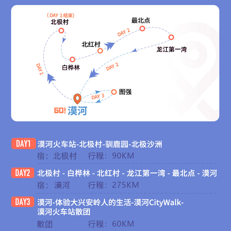 3天2晚的行程设计精准匹配差旅者的碎片化时间窗口。利用周末或短假期即可完成从哈尔滨到漠河的深度体验,无需额外请假。首日乘火车夜宿移动,次日全天游玩,第三日返程——科学的时间分配让您在有限假期内最大化体验价值。这种高效休整模式,正是现代差旅人士平衡工作与生活理想的选择。