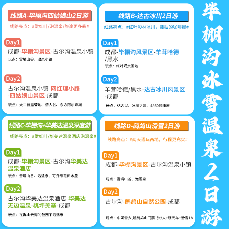 本线路专为从成都出发的差旅人士设计,行程紧凑高效,仅需两天即可深度体验四姑娘山、毕棚沟与达古冰川三大川西核心景区。无需长途跋涉,节省宝贵时间,特别适合周末或小长假出行。理小路沿途风景如画,高山草甸、原始森林与冰川湖泊交相辉映,让商务出行之余也能享受自然疗愈,实现工作与休闲的完美平衡。