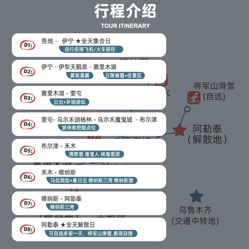 本线路支持1人独立报名参团,无需拼团等待,极大提升了商务人士或独自出行旅客的差旅灵活性。无论您是从乌鲁木齐出发临时决定开启一段冰雪之旅,还是在出差间隙想短暂放松,都能即刻成行,省去协调多人时间的烦恼,真正实现说走就走的高效差旅度假体验。