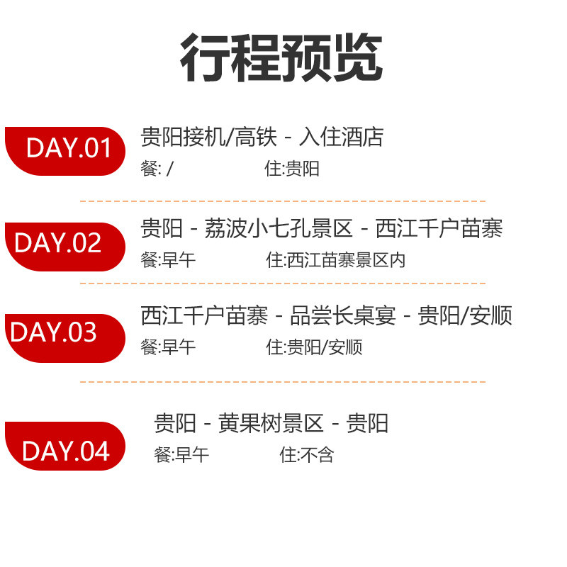 4天3晚内集中游览黄果树大瀑布、荔波小七孔、西江千户苗寨三大世界级景点,涵盖喀斯特地貌奇观、原始森林水系与少数民族文化体验。对时间宝贵的差旅人士而言,一次出行即可领略贵州自然与人文精髓,避免多次往返,显著提升假期投入产出比。