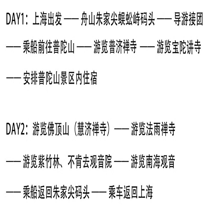 从上海人民广场便捷出发,专为差旅人士设计的二日游线路,无缝衔接工作与心灵休憩。行程安排紧凑合理,首日抵达即开启普陀山核心景点游览,次日登佛顶山完成四大寺庙祈福后返程,确保您在有限时间内兼顾效率与体验。特别适合周末短途差旅或项目间隙放松身心,无需额外规划交通与住宿,全程纯玩无购物,让您的差旅兼具效率与禅意。