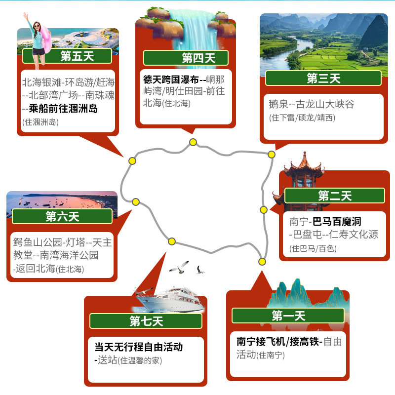线路科学规划南宁—崇左—巴马—北海环线,避免重复折返,最大化节省差旅时间成本。无论您是从南宁出差结束直接开启旅程,还是计划在广西多地商务拜访后顺道游玩,此行程都能无缝对接,实现‘工作+度假’一体化安排,让每一分假期都用在刀刃上。