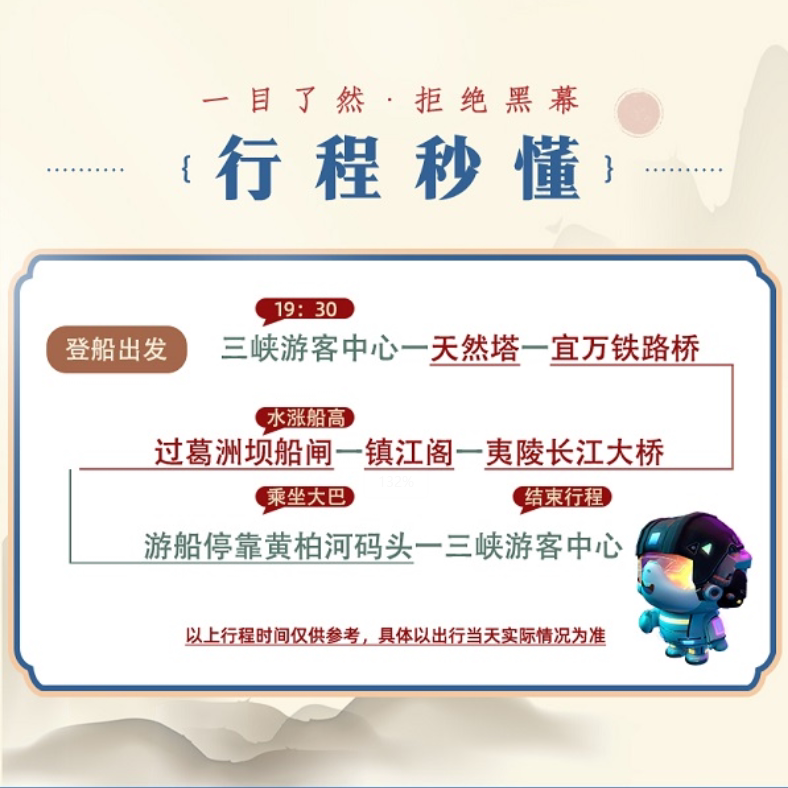 针对差旅人士对时间高度敏感的需求,本产品整合豪华游轮夜游与返程交通,实现‘登船即享、下船即走’的无缝衔接。从宜昌市区出发,轻松登上游轮,在阳光甲板上放松身心,同时饱览三峡夜景与葛洲坝船闸运行实景。全程由官方直营保障服务品质,1人可订机制更契合单人出差场景,让高效差旅也能拥有诗意停顿。