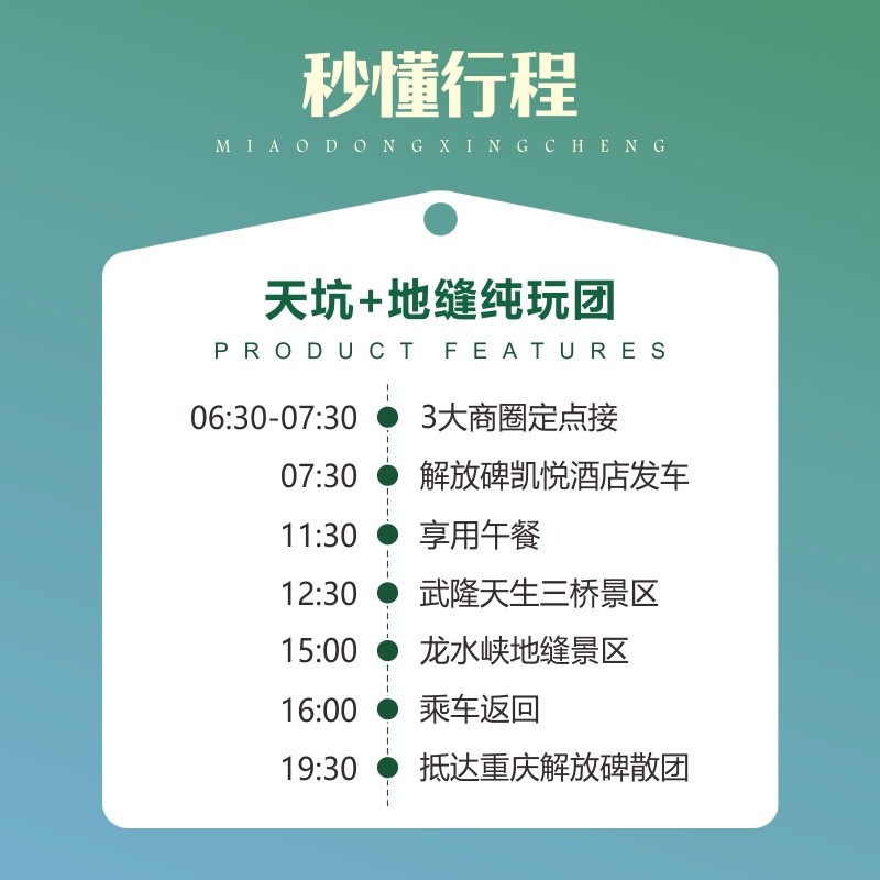 本线路为经典一日游设计,早出晚归,确保游客当天返回重庆市区,不影响次日正常办公或航班安排。特别适合周末或工作间隙短暂休整的差旅人士,在不占用额外假期的前提下,快速切换状态,缓解高强度工作带来的疲劳,提升后续工作效率。