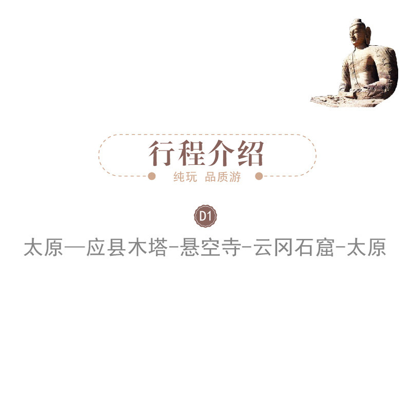 专为商务差旅人士设计,本线路从太原清晨出发,高效串联云冈石窟、悬空寺与应县木塔三大世界文化遗产,行程紧凑却不仓促。全程专业导游讲解,节省自行规划时间,确保您在完成公务之余,轻松体验山西深厚的历史人文底蕴,实现工作与休闲的完美平衡。
