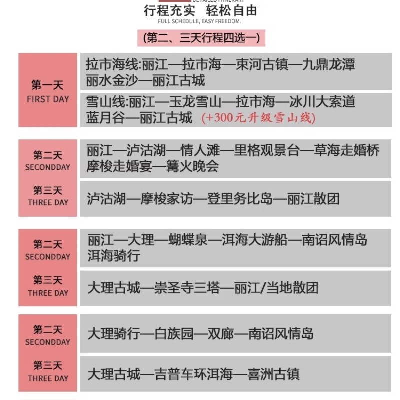 本线路专为时间紧张的差旅人士设计,仅需3天2晚即可深度体验云南丽江、大理、泸沽湖与香格里拉四大核心目的地。行程紧凑却不仓促,合理安排交通与景点衔接,最大化利用有限假期。无论是出差间隙的小憩,还是周末短途放松,都能在高效节奏中领略雪山古城、高原湖泊与藏地风情,实现工作与休闲的无缝切换。