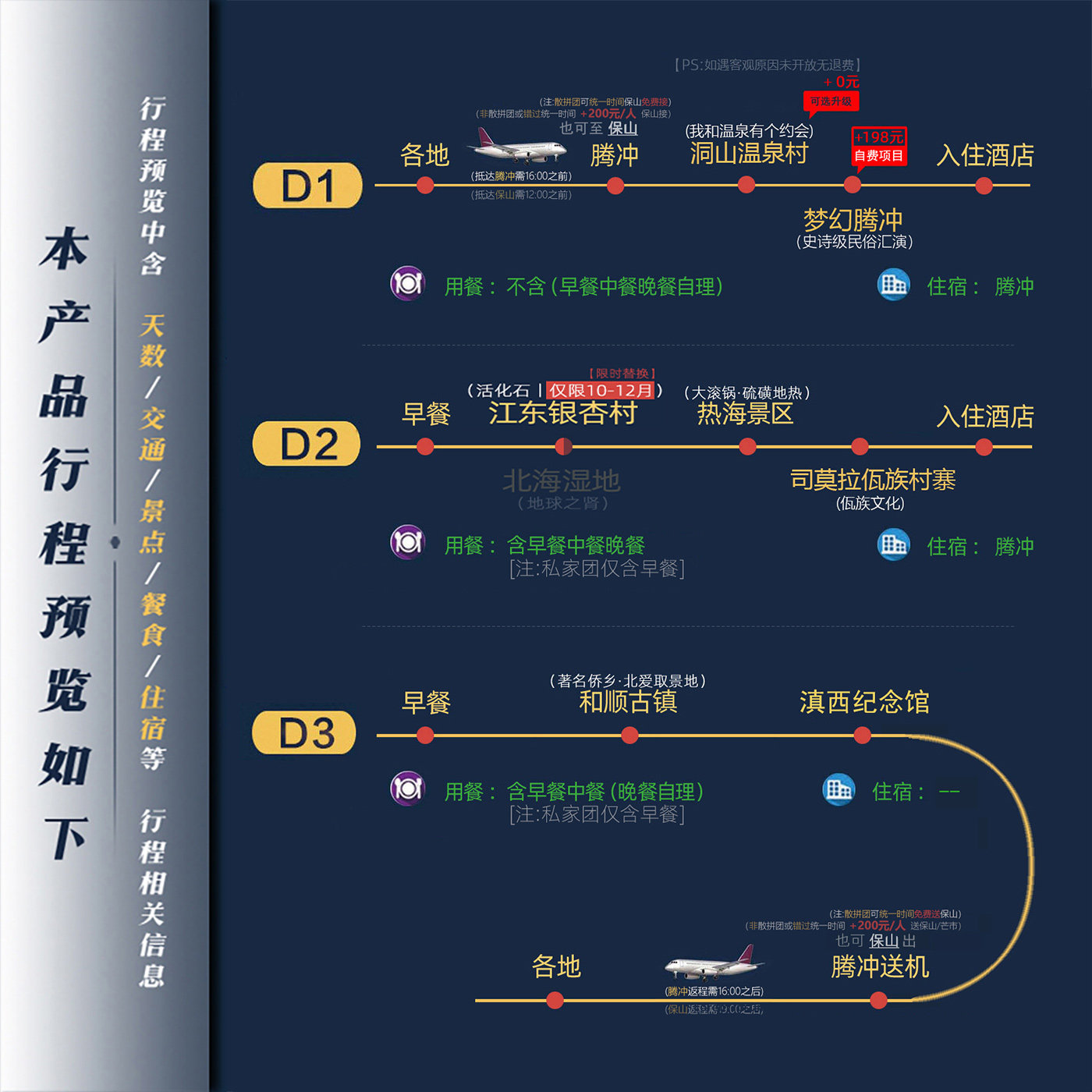 无论您是独自出差还是临时起意延长假期,本产品支持1人即可成行,无需拼团等待。对于经常单人出差的商务人士而言,这极大提升了出行自由度。抵达保山后无缝衔接3日纯玩行程,涵盖温泉、古村、民族美食等元素,让您在高效完成公务之余,迅速切换至放松模式,享受身心双重疗愈。