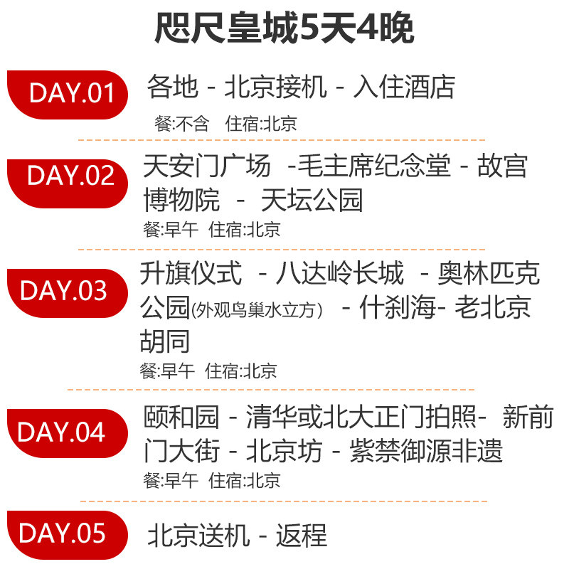 专为北京本地家庭及差旅人士设计,无需奔波赶路,从家门口开启5天4晚深度文化之旅。行程涵盖故宫、长城、升旗仪式等经典景点,全程一价全含,省去交通衔接烦恼。特别适合利用周末或小长假进行短途度假的商务家庭,兼顾孩子教育与父母放松,真正实现‘说走就走’的轻松差旅体验。