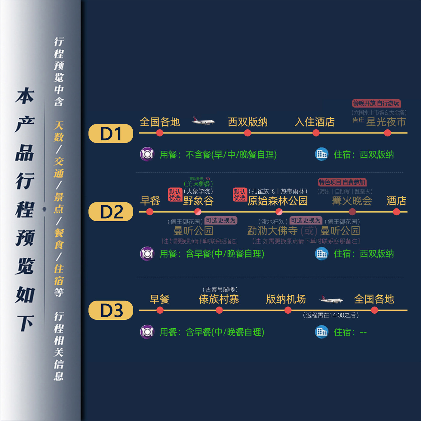 本产品以“主题游”为核心理念,3日内高效串联热带雨林探险、傣族村寨人文、泼水节民俗体验三大板块,避免走马观花。差旅人士无需自行规划路线或协调交通,专业团队已优化动线与时间分配,确保每个体验环节深度且流畅。这种主题化打包服务,极大节省决策成本,让短暂假期价值最大化。