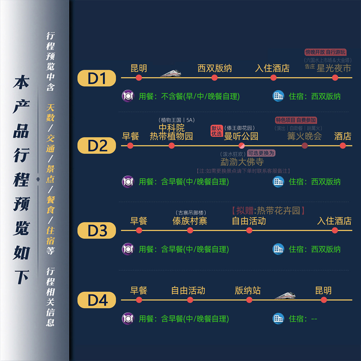 本行程专为兼顾差旅效率与休闲度假需求的旅客设计,从昆明出发搭乘舒适动车快速抵达西双版纳,节省交通时间的同时享受独立私家团服务。全程无购物、无隐形消费,4日纯玩安排紧凑却不赶路,特别适合商务人士在会议或出差间隙安排短途深度游,既高效又放松。