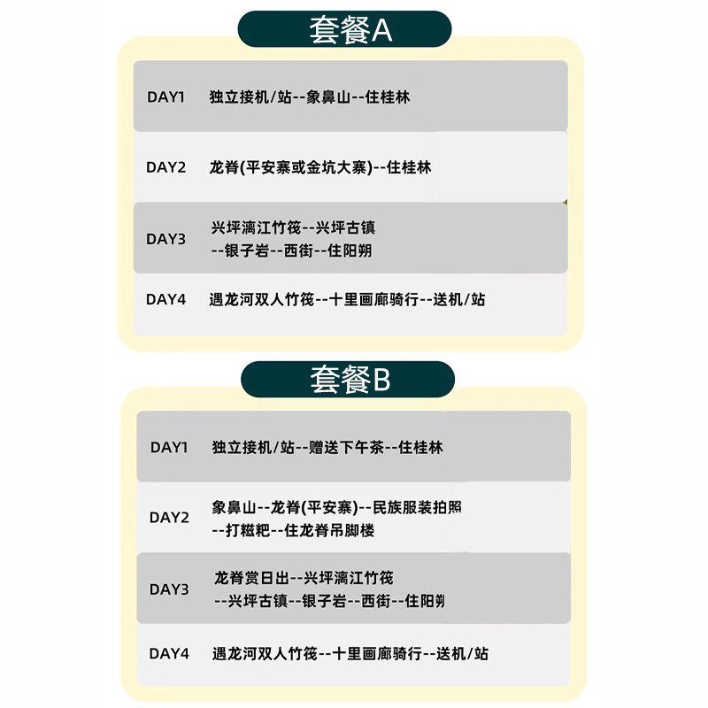针对差旅人群时间宝贵的特点,本产品严格承诺‘纯玩无购物店’,所有行程聚焦核心景观与体验。从桂林接机到阳朔、龙脊梯田、漓江精华段全覆盖,每日车程合理分配,避免无效等待。4天3晚的紧凑设计,恰好匹配多数企业差旅审批周期,让短暂假期也能收获完整山水人文体验。