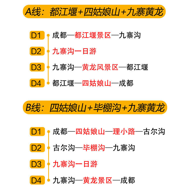 精心规划的4天3晚行程,完美契合周末+年假组合或短期调休场景。第一天成都出发,次日深入九寨沟,第三天探访黄龙与四姑娘山,第四天返程,节奏张弛有度。差旅人士无需请长假,即可完成一次高海拔自然秘境之旅,实现“短时长、高回报”的度假目标,平衡工作与生活。