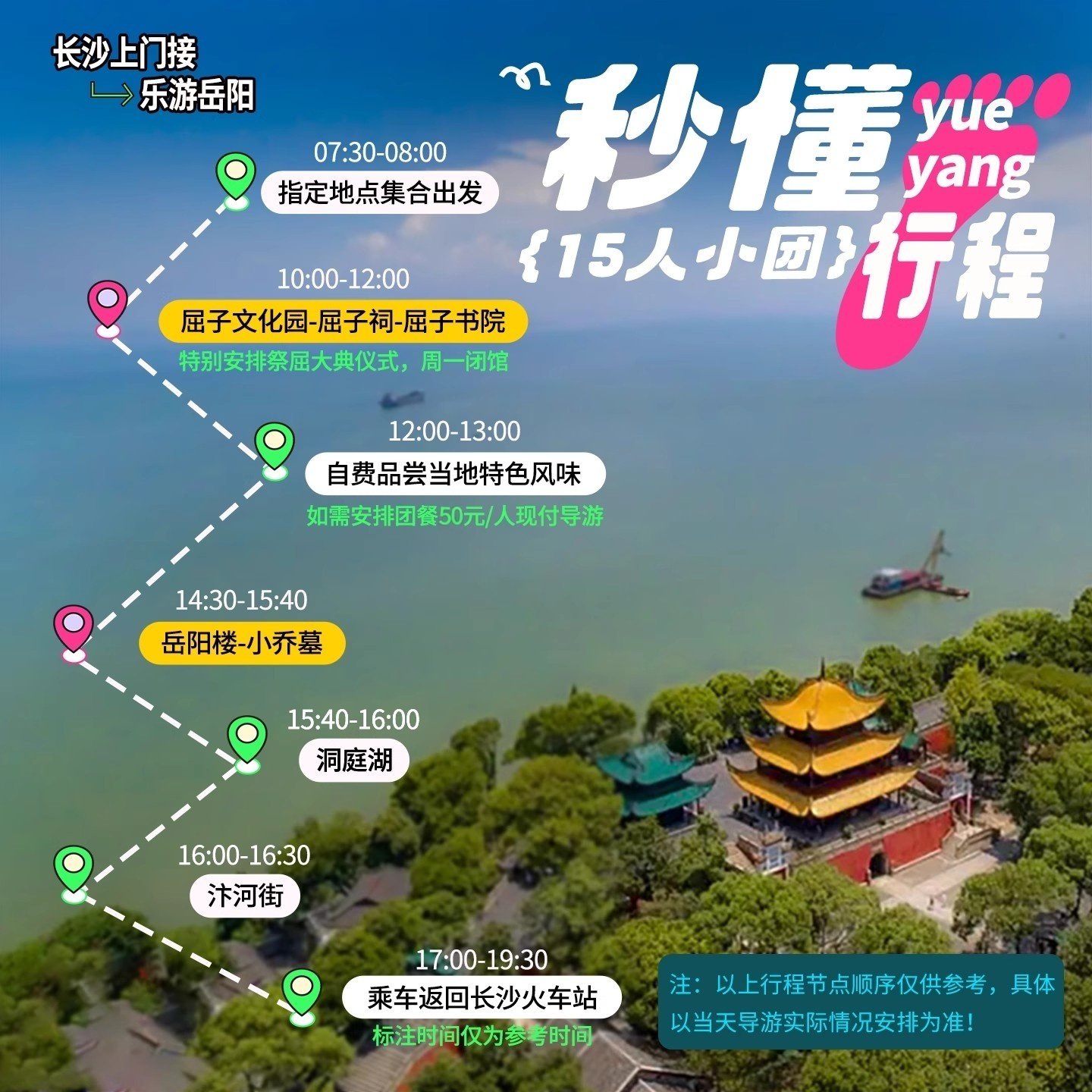针对差旅人士对时间与体验质量的高要求,本产品坚持“纯玩”原则,全程无购物店、无强制消费,确保每一分钟都用于核心文化景点深度游览。从长沙出发至岳阳各站点,行程节奏张弛有度,既满足高效出行需求,又保障文化体验的纯粹性,让差旅回归探索与收获的本质。