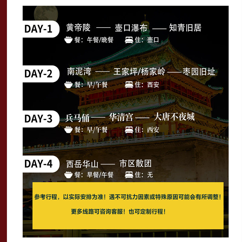 本行程专为差旅人士设计,从西安出发,高效串联渭南、延安两大目的地,4天3晚紧凑安排,兼顾商务与休闲。您可在工作之余探访兵马俑、华山、壶口瀑布等世界级景点,体验大唐不夜城的盛唐风情与延安红色文化,实现高效出行与深度度假的完美融合,节省中转时间,提升差旅价值。