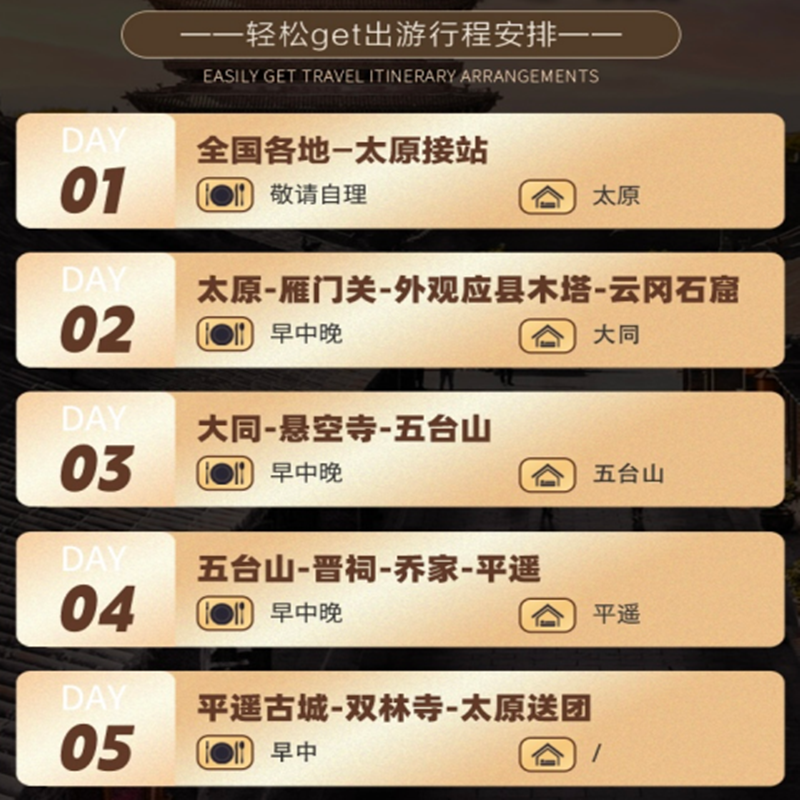 本产品以‘历史古建+人文旅行’为主题,剔除冗余购物环节,专注高品质文化体验。行程节奏张弛有度,每日核心景点控制在2-3个,留有充足休息与自由活动时间,契合商务人士对效率与品质的双重需求。无论是晨起参观晋祠,还是午后漫步平遥街巷,都能在从容中感受三晋大地的厚重与雅致。