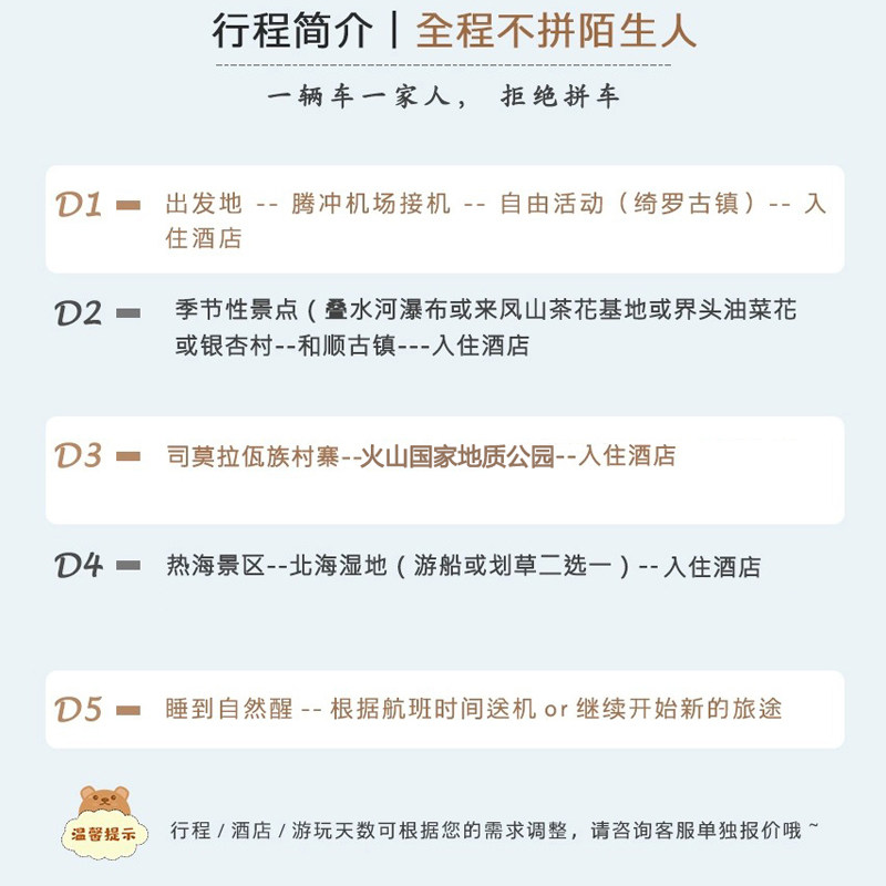 本行程专为从昆明出发的差旅人士设计,交通衔接顺畅,节省中转时间。无论是结束会议后的放松之旅,还是出差间隙的小憩,5天4晚的行程安排合理,既能高效完成工作,又能深入体验腾冲银杏村、和顺古镇等人文景观,实现商务与度假的完美平衡。