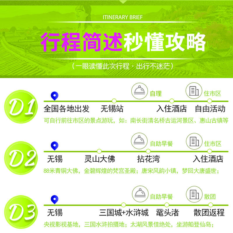 专为时间宝贵的差旅人士优化设计,3天2晚行程科学分配,覆盖无锡核心景点而不显仓促。从灵山大佛到鼋头渚,从拈花湾到三国城,每日路线合理衔接,减少无效交通耗时。全程跟团省去自行导航、购票、排队等繁琐环节,让您在有限时间内高效完成观光与休整,真正做到“短假高效、满载而归”。