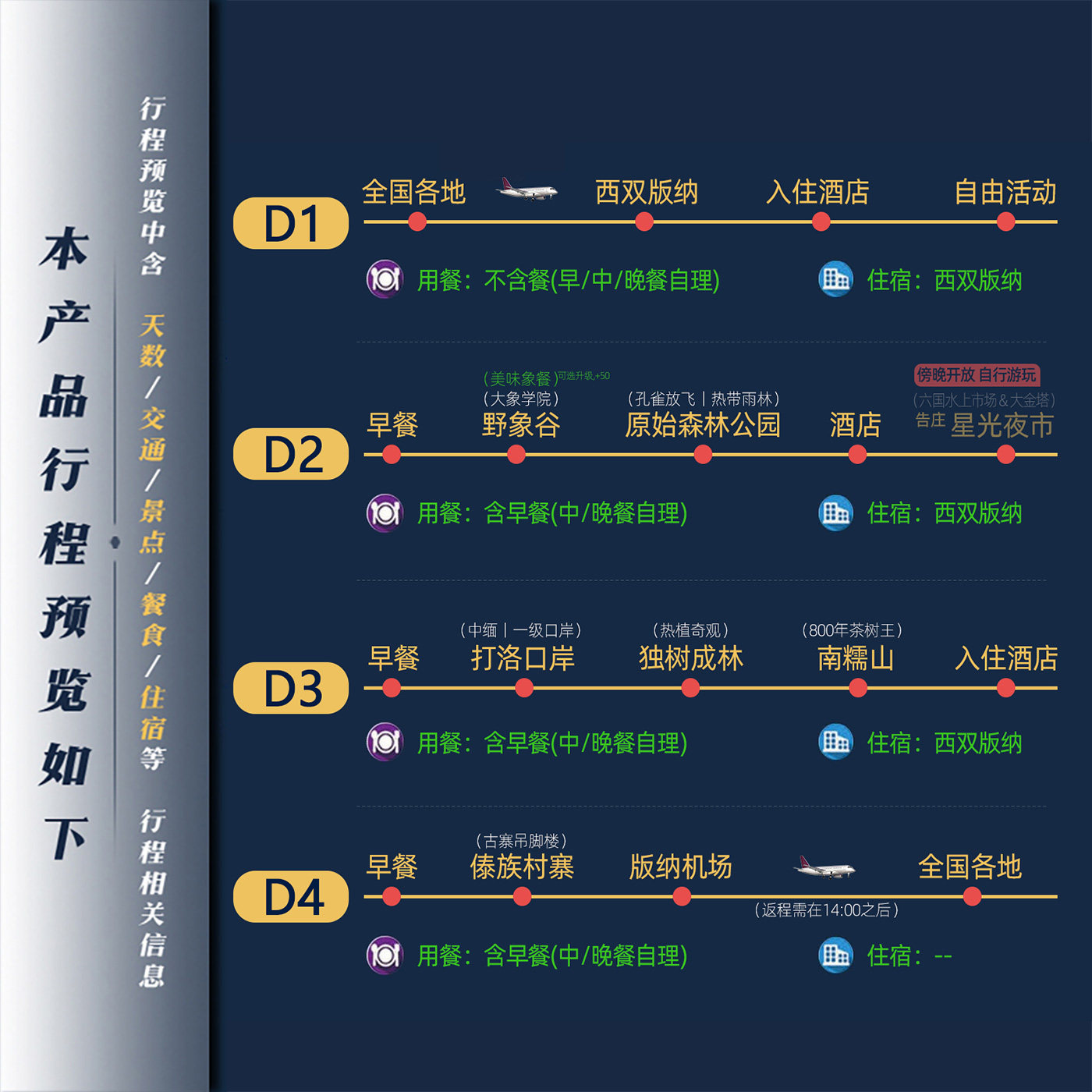 整合“人文旅行+主题游”双重标签,本产品以傣族文化为主线,串联美食、建筑、民俗、生态四大维度,形成高度聚焦的主题体验。差旅者无需自行规划碎片信息,在4天内即可系统感知西双版纳精髓。这种主题化设计大幅降低决策成本,是追求高效、深度、省心差旅度假的理想选择。