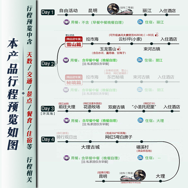 本行程采用昆明至丽江/大理的动车交通方式,大幅缩短路途耗时,避免长途大巴疲劳。对于差旅人士而言,白天可灵活安排工作或会议,傍晚即抵达下一站目的地,无缝衔接休闲与效率。动车班次稳定、准点率高,确保您的行程节奏可控,真正实现‘上午开会、下午看雪山’的高效度假模式。