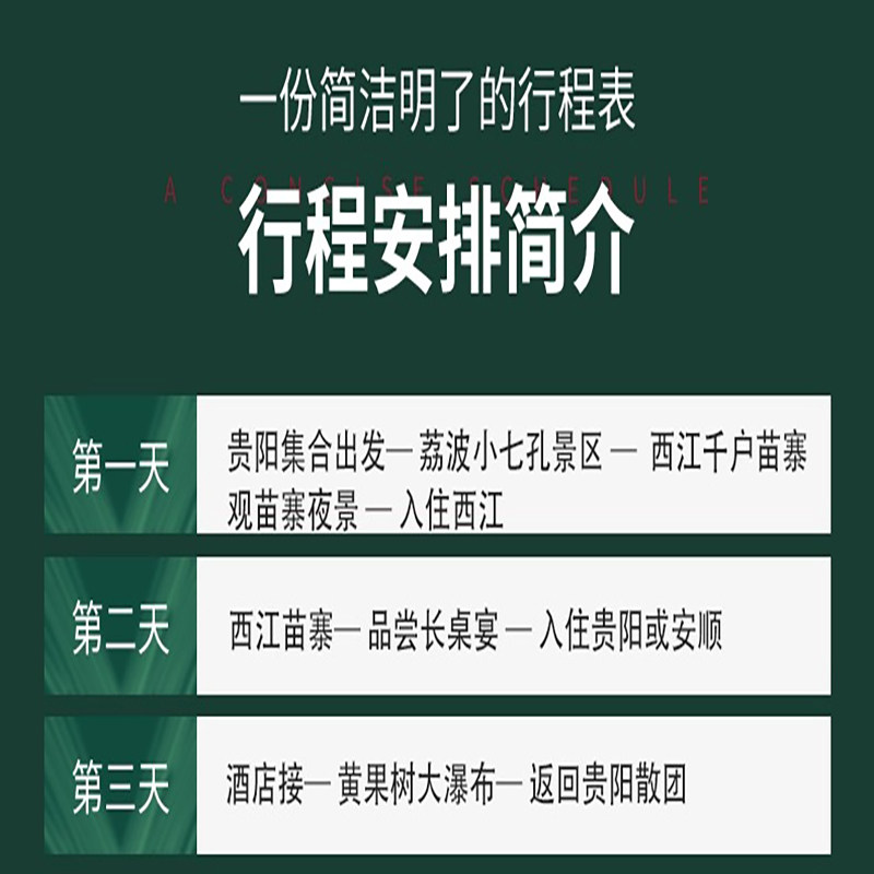 从贵阳便捷出发,3天2晚行程科学规划,轻松覆盖黄果树瀑布、小七孔、西江千户苗寨三大核心目的地。特别适合商务人士利用周末或短假期出行,无需额外请假,交通接驳顺畅,全程跟团省心省力,真正实现‘出差+度假’两不误的高效旅行体验。