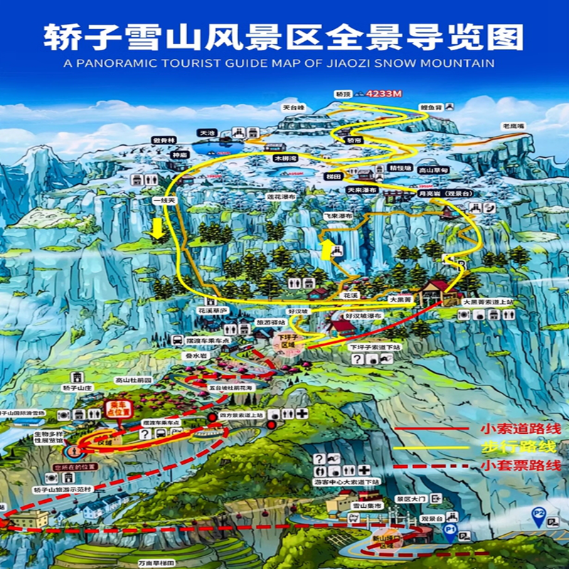 轿子雪山景区面积广阔,但本行程已优化交通动线:从游客中心乘坐观光摆渡车至索道站,再换乘大索道上山,全程无缝衔接。差旅人士无需研究路线或担心迷路,节省体力与时间,最大化游览效率。