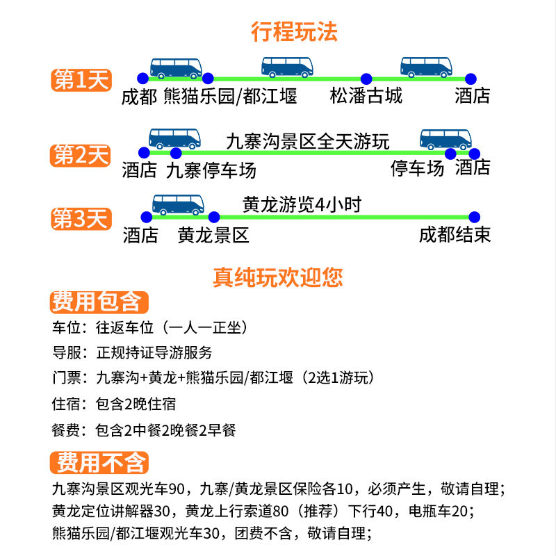 行程从成都出发,无缝衔接熊猫基地、都江堰、黄龙及九寨沟四大世界级景点,路线经过精心优化,减少无效交通耗时。特别适合利用周末或3天小长假进行差旅延伸度假。全程采用舒适商务车接送,确保旅途高效舒适,让差旅人士在有限时间内最大化体验川西自然与人文精华。