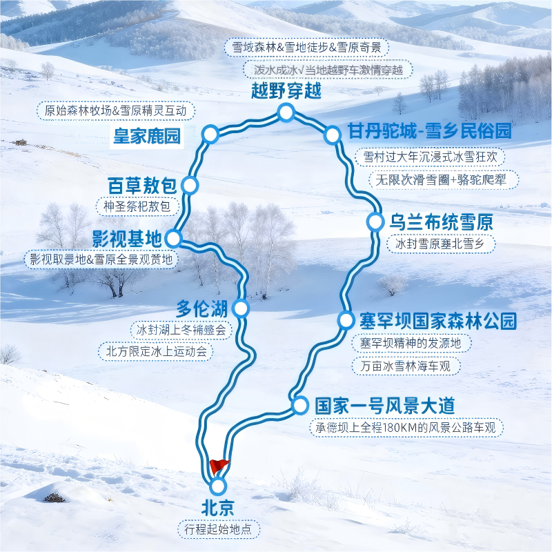 从北京出发,便捷抵达赤峰与承德交界地带的乌兰布统草原,地理位置优越,适合作为京津冀地区差旅后的延伸度假选择。无论是结束在京会议还是项目收尾,均可无缝衔接这段冰雪之旅,省去长途转机烦恼,最大化利用周末或小长假,实现‘出差+休闲’一体化行程规划。