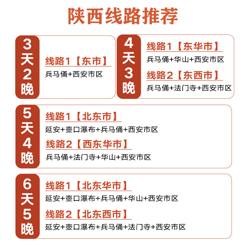 本行程支持1人即可成团预订,特别适合商务出差间隙或独自出行的旅客。无需等待拼团,行程安排紧凑高效,兼顾工作与休闲。6天5晚深度覆盖西安、延安、渭南、咸阳、宝鸡五大城市,既能打卡兵马俑、华清池等世界级文化遗产,又可登临华山、观壶口瀑布,满足差旅人士对时间效率与文化体验的双重需求。