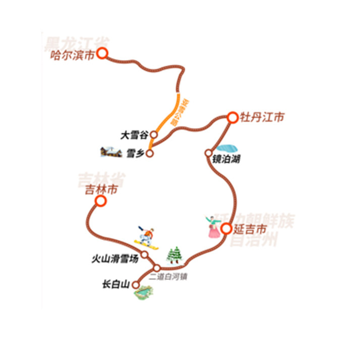 行程从哈尔滨启程,科学串联白山(长白山)、牡丹江(雪乡)、延边(延吉)三大热门区域,7天6晚紧凑安排,最大化利用差旅时间。您可在完成哈尔滨本地公务后,直接开启冰雪度假模式,无需额外中转规划,省时省力,实现工作与旅行的完美平衡。