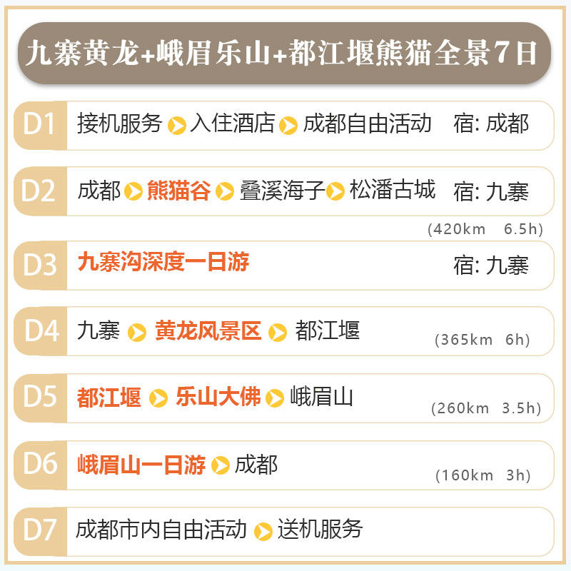 专为时间宝贵的差旅人群设计,七日行程形成高效闭环:成都始发,经乐山、峨眉山、都江堰至九寨沟,再返回成都,避免重复折返。每日车程合理控制,景点衔接流畅,确保即使仅用周末+年假组合也能完整体验川西精华。私家小团专属调度更可配合航班/高铁时刻微调,让每一分钟差旅时间都物尽其用。