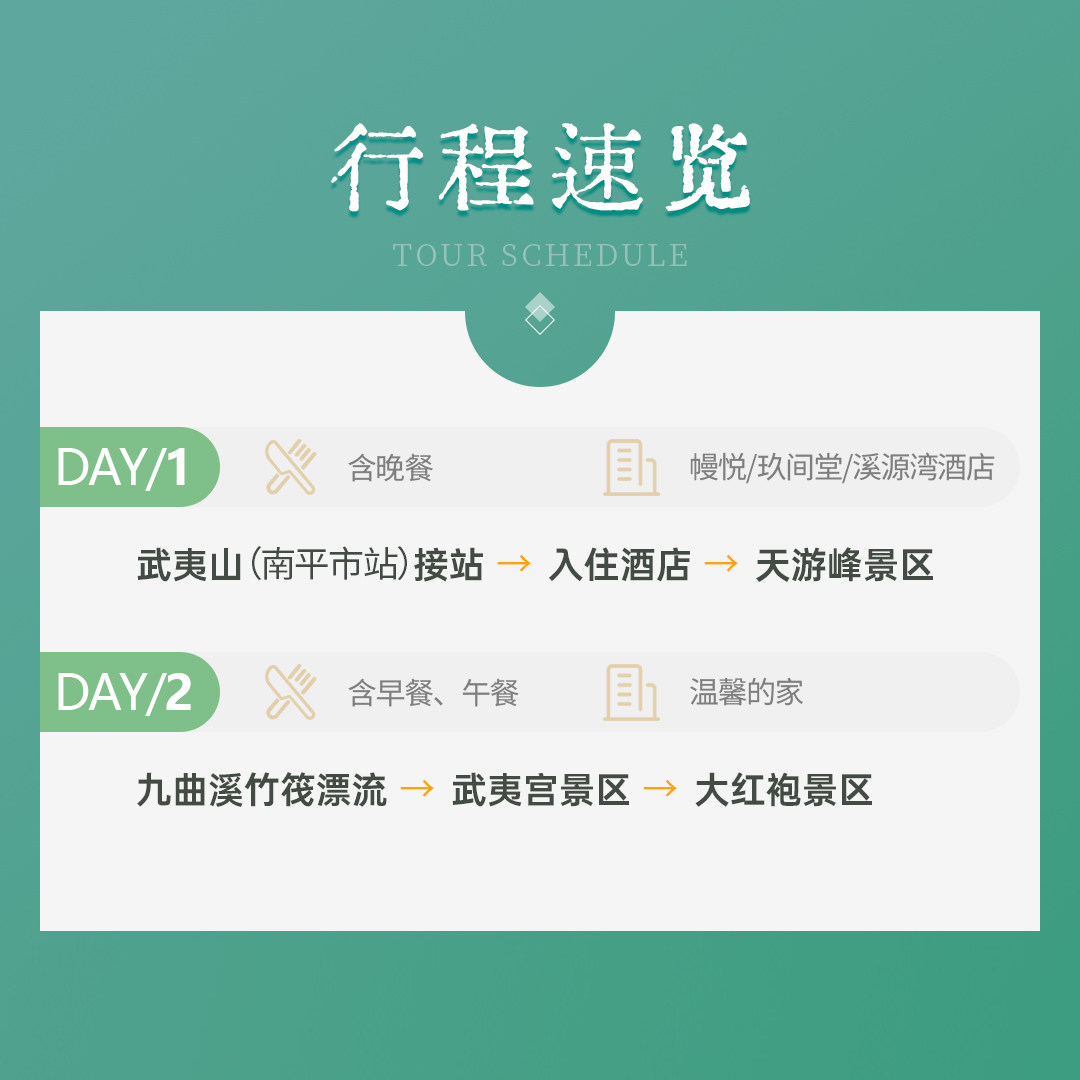 从交通、住宿、门票到餐饮,所有环节均已打包整合,差旅人士无需分别预订比价。尤其九曲溪竹筏票务常需提前预约,本产品已含此稀缺资源,避免现场排队或无票风险。您只需专注于享受旅程,其余琐事交给我们,真正实现‘拎包即度假’的高效差旅体验。