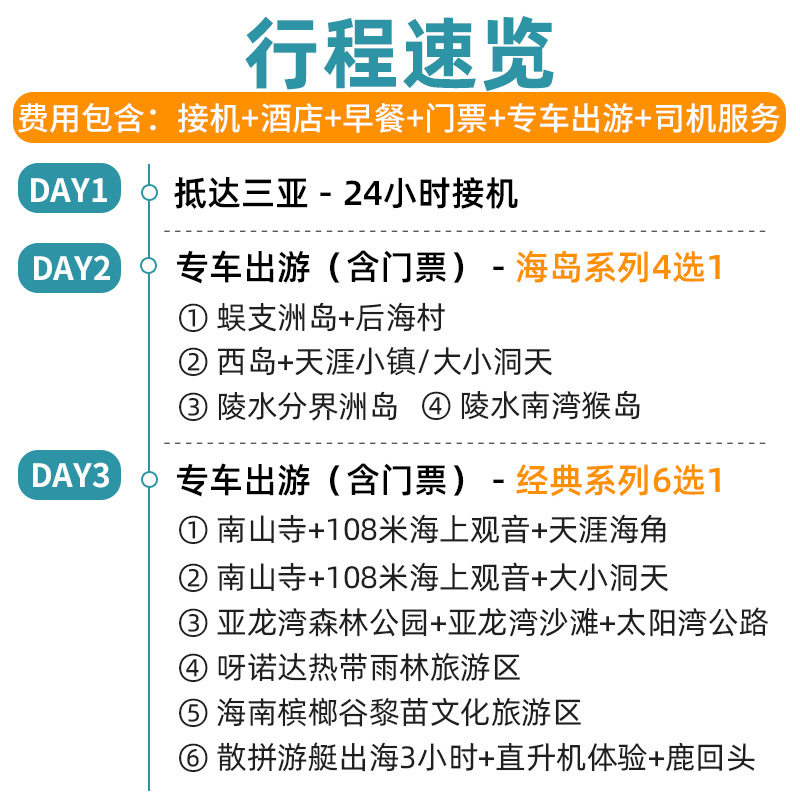 本产品出发地与目的地均为三亚,适用于已在三亚出差或会议结束后的延伸度假需求。无需额外安排跨城交通,直接开启纯玩模式,最大化利用当地停留时间,避免舟车劳顿,真正实现‘落地即度假’的高效差旅衔接。