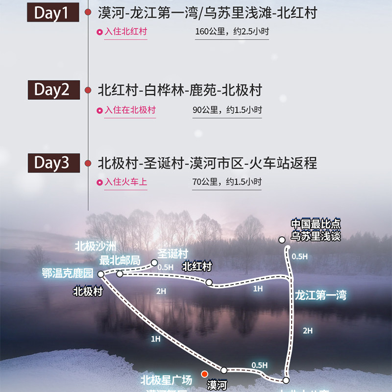 专为时间紧张的差旅人群设计,3天2晚行程高效串联北极村、北红村、圣诞村及白桦林等大兴安岭精华目的地。无需冗长假期,利用周末或短假即可深度体验中国最北端的独特风光,兼顾工作效率与度假品质,让短暂差旅也能收获难忘回忆。
