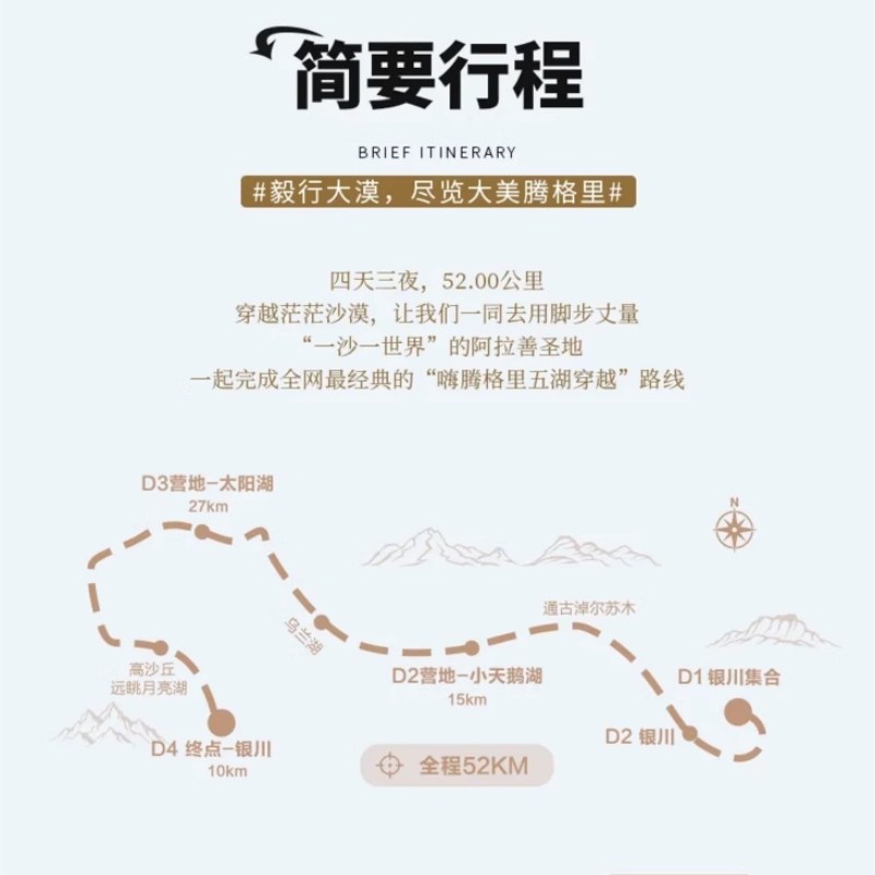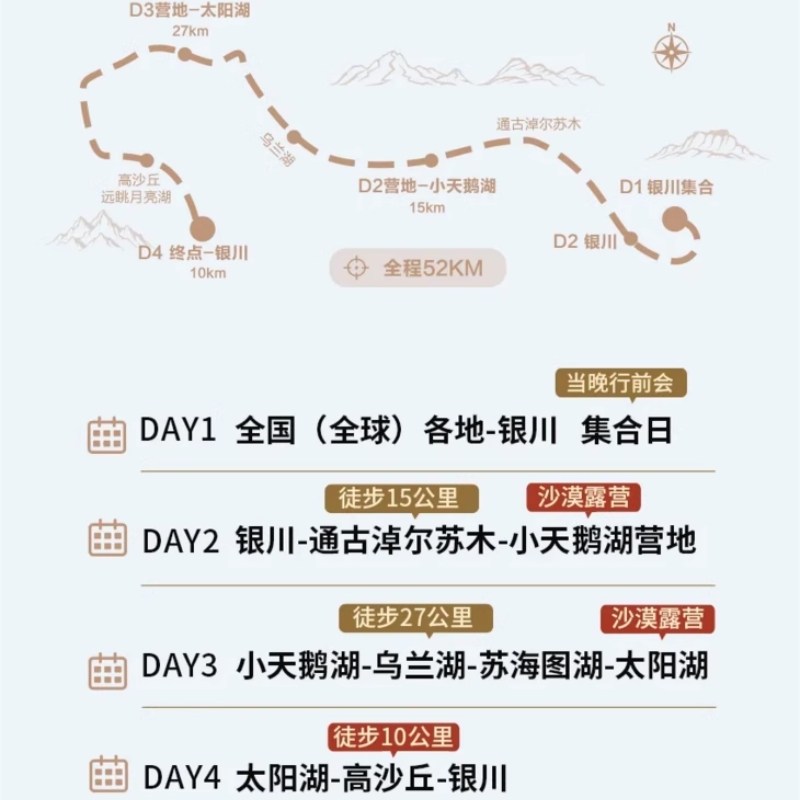 行程以宁夏银川为起点和终点,方便来自全国各地的差旅人士搭乘高铁或航班抵达后直接开启旅程。银川作为西北重要交通枢纽,航班密集、铁路通达,极大节省中转时间。结束4日沙漠穿越后,可当日返程或继续在银川处理公务,行程设计充分考虑差旅人群对时间效率与交通便利性的核心需求,让度假与工作节奏完美融合。