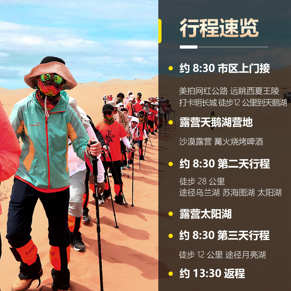 针对经常独自出差的职场人士,本产品支持1人即可成行,无需拼团等待或额外加价。无论是临时调休还是周末延伸假期,都能即刻预订、说走就走。全程专业领队带队,安全保障完善,让您在高强度工作之余,轻松享受腾格里沙漠的宁静与壮美,释放压力,重拾活力。