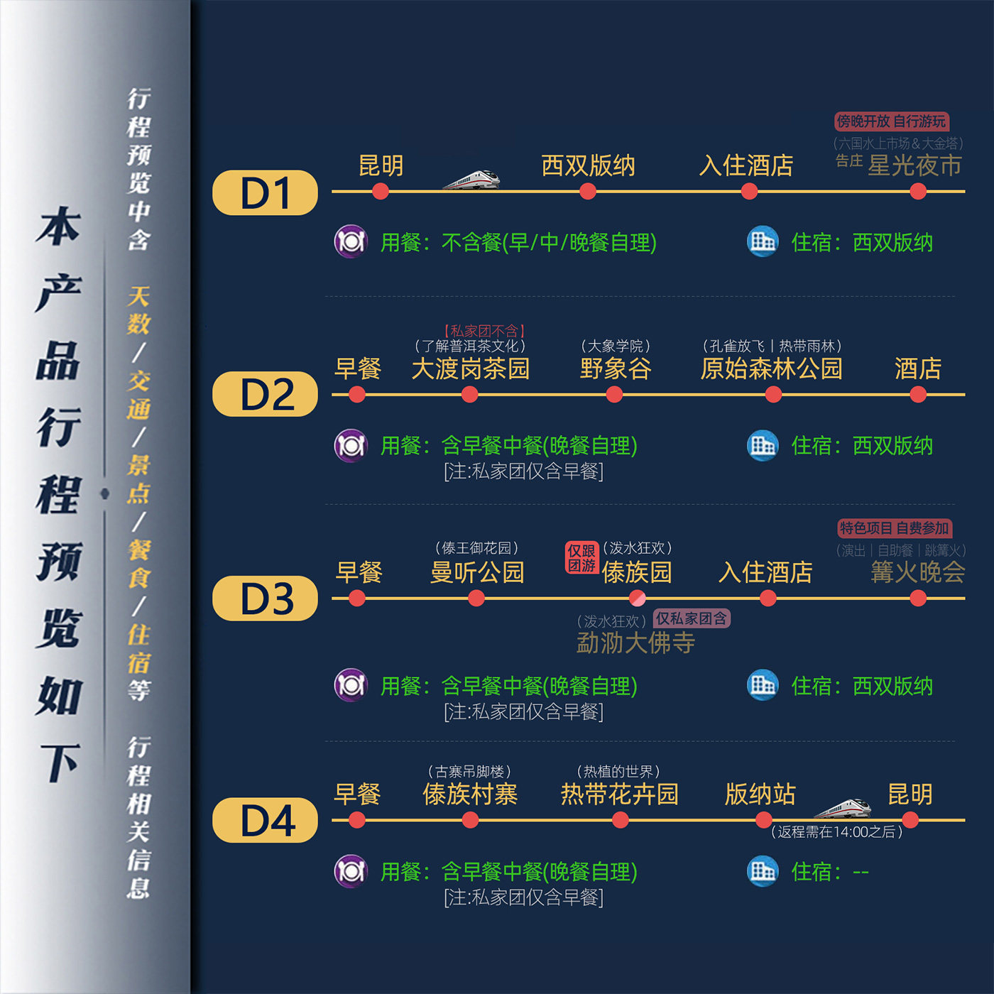 本行程采用昆明至西双版纳动车往返,全程仅需约3.5小时,极大提升出行效率,特别适合工作繁忙的差旅人士。无需忍受长途汽车颠簸或航班延误风险,动车准点率高、舒适度佳,让您的假期从出发那一刻起就轻松无忧。抵达后即刻开启度假模式,真正实现‘说走就走’的高效差旅体验。